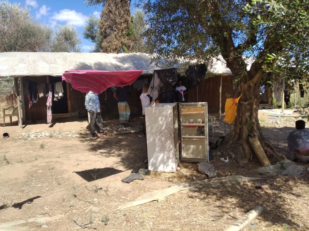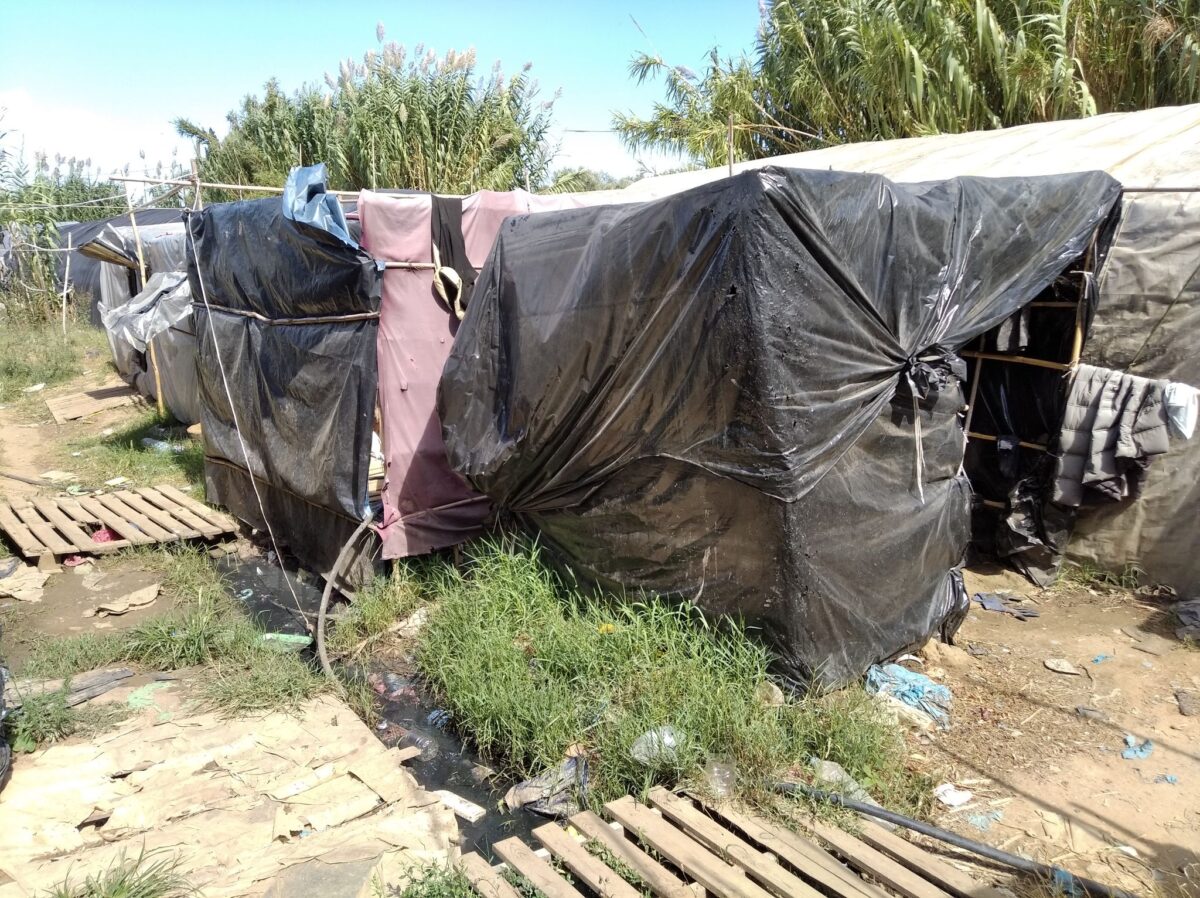 Οι συνθήκες διαβίωσης δεν παρουσιάζουν καμία βελτίωση. Στον καταυλισμό, τον οποίο επισκεπτόμαστε σταθερά, παραμένουν οι αυτοσχέδιες παράγκες από καλάμια, σίδερα και νάιλον θερμοκηπίου. Όπως μας ενημέρωσαν οι εργάτες γης, όταν βρέχει πολύ μπαίνουν νερά μέσα στις παράγκες. Αυτή τη χρονική περίοδο στον καταυλισμό διαμένουν περίπου 100 άτομα. Ανά παράγκα μένουν 10 άτομα και αποδίδουν μηνιαίο ενοίκιο 25-30 ευρώ το άτομο. Κατά την υψηλή καλλιεργητική περίοδο το ενοίκιο αυτό αυξάνεται στα 35-40 ευρώ. Τα ποσά αυτά συγκεντρώνονται και αποδίδονται στον ιδιοκτήτη της έκτασης. Μια παροχή νερού που υπήρχε στα σύνορα μεταξύ του οικοπέδου του καταυλισμού και των κατοικιών του χωριού είναι κλειστή και ζητείται υψηλό χρηματικό ποσό στους διαμένοντες εργάτες γης, προκειμένου να ανοίξει ξανά. Η παροχή νερού γίνεται μέσω μικρών πλαστικών δεξαμενών. Συνεχίζεται η συγκέντρωση τεράστιων ποσοτήτων απορριμμάτων και δεν υπάρχει καμία πρόβλεψη για τη συλλογή τους και την αποκομιδή τους από τον καταυλισμό. Οι τουαλέτες είναι αυτοσχέδιες με αποτέλεσμα τα λύματα να συγκεντρώνονται και να παραμένουν εκεί. Γενικότερα, όλος ο καταυλισμός διατρέχεται από αυλάκια με λιμνάζοντα ύδατα και λύματα, καθιστώντας άμεσο τον υγειονομικό κίνδυνο, ενώ είναι έντονη η παρουσία εντόμων και τρωκτικών.